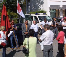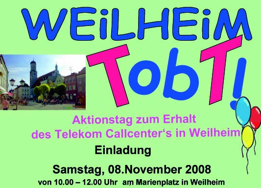 Seit 22.August 08 gehen die Weilheimer Call-Center-Mitarbeiter auf die Straße. Sie demonstrieren in erster Linie gegen ihre Verlagerung ins schlecht zu erreichende Kempten, aber auch generell gegen die Telekom-Entscheidung in 63 Städten Deutschlands die Call-Center zu schleifen. In größere "Einheiten" sollen sie danach - so der Wille des Managements - kostengünstiger zusammengefasst sein. In Zahlen heißt das, die Call-Center in 63 Städten werden monopolisiert auf 24 Städte mit durchschnittlich 700 MitarbeiterInnen. Voraussichtliche Kosten? 70 Mio. EU!!