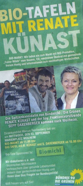 Daxenberger, selbst Bio-Landwirt, konzentrierte sich in seiner Rede hauptsächlich auf die heimische Landwirtschaft und die aktuelle Milchpreis-Problematik. Dabei unterstützte er, als Mitglied im BDM, die Forderungen der Bundes Deutscher Milchviehhalter ausdrücklich. "Wehrt euch gegen die Industrialisierung der Landwirtschaft", so seine Mahnung und Forderung. Vornehmlich Großkonzerne - etwa Müller-Milch - realisieren aktuell in Ostdeutschland Milchviehwirtschaft mit 1000 und mehr Milchkühen, um die Landwirtschaft traditioneller Form auszuhebeln. Eine neue Form der Industrialisierung nannte er dies, um letztlich die aufmüpfigen Bauern mit ihren Milchpreisforerungen zu umgehen.