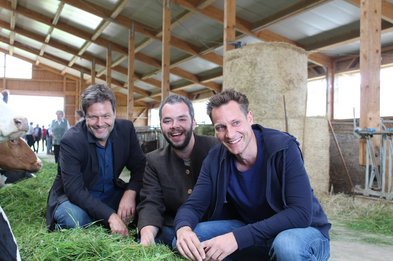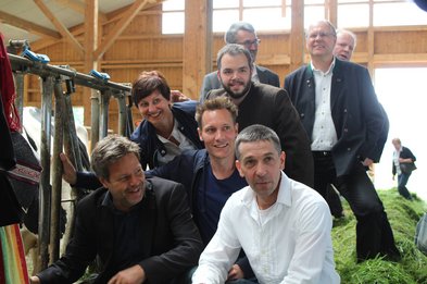 Der BDM hat eingeladen und die Bauern und Bäuer*innen aus dem Oberland kamen. Es gab phantastisches Essen, Bier zum Frühschoppen, Blasmusik und viele Trachten. Unsere Landwirt*innen lieben es zu Recht traditionsbewusst und Familie Dopfer hat offensichtlich keine Mühen gescheut, den Hof und deren Hauptdarstellerinnen, die Kühe, in bestem Licht zu präsentieren. Kurz bevor der Landwirtschaftsminister aus Schleswig-Holstein und Parteivorsitzende der Grünen, Robert Habeck, in Begleitung des grünen Spitzenkandidatenzur Landtagswahl, Ludwig Hartmann und der bayerischen Landesvorsitzenden Sigi Hagl am Hof ankamen, half Herr Dopfer unter den Augen unseres Direktkandidaten Andreas Krahl noch einem Kalb auf die Welt. Es wurden Grußworte in klingendem Dialekt gesprochen, Vize-Landrat Karl-Heinz Grehl machte auf den Migrationshintergrund der Rinder aufmerksam und bei ausgelassener Stimmung betrat Robert Habeck die Bühne.