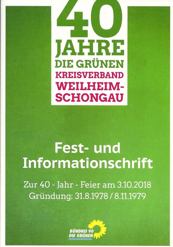 Zur 40-Jahr-Feier wurde eine 20-seitige Festschrift erstellt, in der man eine „Kurze Chronik mit Milestones“ nachlesen kann, sämtliche Kreisvorstände von 1978 – 2018, alle Mandatsträger*innen von 1984 – 2018 und alle Direktkandidat*innen mit Wahlergebnissen im Landkreis zu den Bezirks-, Landtags,- Bundestags- und Europawahlen von 1978 - 2018. Zur 40-Jahr-Feier konnten wir interessante Festredner gewinnen: Beate Walter-Rosenheimer, die Bundestagsabgeordnete aus dem Landkreis Fürstenfeldbruck, unseren chancenreichen Landtagskandidaten aus dem Stimmkreis Weilheim-Schongau, Andreas Krahl, und den Bezirkstagskandidaten und Chronisten der Kreisverbands-Geschichte, Dr. Eckart Stüber. So wird die Politik auf Bundes- Landes- und Bezirksebene thematisiert. Die musikalische Begleitung erfolgt durch 2 Mitglieder der jungen Musikgruppe „DiePlomaten mit modernen, frischen Klängen. Zum Schluss gibt es auch noch ein paar „Feierhäppchen“.