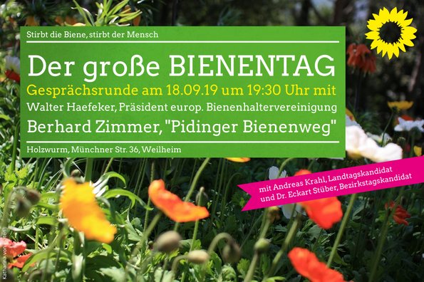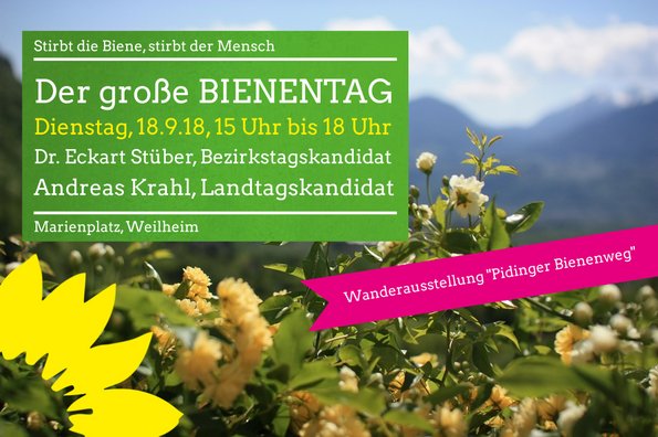 Am 18.09.2018 präsentieren die Weilheimer Grünen die Wanderausstellung zum Thema Bienen des Landtagskandidaten aus dem Berchtesgadener Land, Bernhard Zimmer, am Nach- mittag von 15.00 - 18.00 Uhr auf dem Marienplatz. Am Abend findet eine fach- politische Veranstaltung zum Thema Bienen, Situation und Zukunftsaussichten, mit dem Europäischen Präsidenten der Bienenhalter*innen, Walter Haefeker, und Bernhard Zimmer 19.30Uhr in der Gaststätte Holzwurm ganz in der Nähe des Bahnhofes statt (keine 5 Gehminuten). Die Einfüh- rung zum Thema erfolgt durch Bezirkstagskandidat, Dr. Eckart Stüber, und Hobbyimker und Landtagskandidat der Grünen im Stimmkreis Weilheim-Schongau, Andreas Krahl.