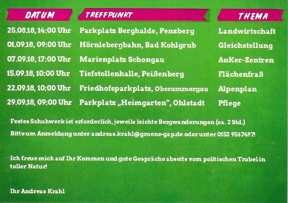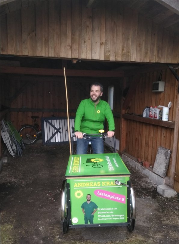 Am 18.03.2018 beginnt der Landtagskandidat von Bündnis90/Die Grünen im Stimmkreis Weilheim-Schongau, Andreas Krahl, als erster, seinen Wahlkampf mit einer Radltour. Alle, die sich wundern, was da für ein Typ mit einem komischen Fahrdreirad daherkommt, sind aufgerufen, sich mit ihm in Kontakt zu setzen und ihn nach seinen Zielen zu fragen. Die genauen Tourdaten sind im unteren link nachzulesen.