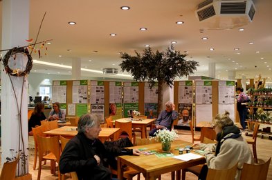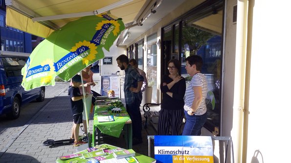 Bei der Hälfte seiner 2-wöchigen Wahlkampfradltour durch den Stimmkreis Weilheim- Schongau bekommt Andreas Krahl, Direktkandidat für den Landtag von den Grünen, eine Stärkung im Biomichl in Weilheim: Ein Weißwurstfrühstück mit dem Direktkandidaten für den Bezirkstag Dr. Eckart Stüber und 15 weiteren Interessierten. Beide unserer Kandidaten entwickeln in ihren jeweiligen politischen Statements anstelle von theoretischen „es müsste mal einer“-Vorhaben praktische Vorschläge. Dr. Eckart Stüber sieht als Schwerpunkte für seine Bezirkstagsarbeit eine Ausdehnung von Landschaftsschutzgebieten und die Stärkung ihrer Bedeutung, die verstärkte Integration von Menschen mit geistiger und körperlicher Einschränkung in dein "normales" Berufsleben sowie die bessere personelle und finanzielle Ausstattung der Imkerfachberatungsstelle in Weilheim, und die bessere Bezahlung von Mitarbeitern des Freilichtmuseums Glentleiten, beides Einrichtungen des Bezirks im Stimmkreis. Andreas Krahl hat in seinem Landtagswahlkampf die Einrichtung einer Pflegekammer als ersten Schritt zur Verbesserung der Ausbildungs- und Arbeitssituation der pflegenden Berufe, an oberer Stelle auf seiner Agenda und die Verbesserung der Hilfestellung bei der Umstellung auf ökologische Landwirtschaft und bei den Rahmenbedingungen für die Frauen in der Landwirtschaft, z.B. Dorfhelfer*innen.