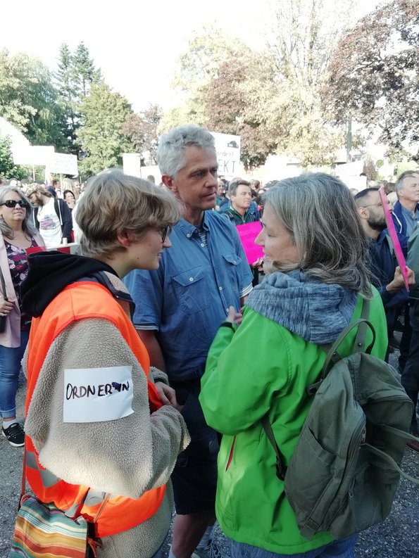 Kurz vor 19 Uhr neigte sich die friedliche Demo ihrem Ende zu, untermalt von dem laut vernehmbaren Songtext der „Ärzte“: "…du bist nicht schuld, dass die Welt so ist wie sie ist, aber du bist schuld, wenn sie so bleibt!"