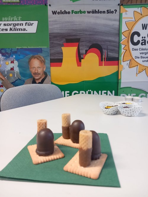 Gebastelte kulinarische Atomkraftwerke aus Mini-Schokoküssen und Waffeletten mit Butterkeks und leckere Brownies als Atomdreck-Häufchen mit Strahlungs-Warn-Plaketten obendrauf wurden genauso gern „vernichtet“ wie Kartoffelsalat mit Hanf-Bällchen ohne berauschender Wirkung und viel Sekt mit berauschender Wirkung.