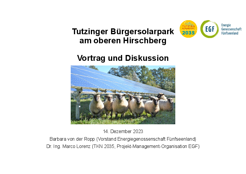 Der Tutzinger Bürgersolarpark - ein beispielhaftes Projekt unserer nördlichen Nachbarn. Ein Vortrag vom 14.12.2023 zeigt den aktuellen Stand.