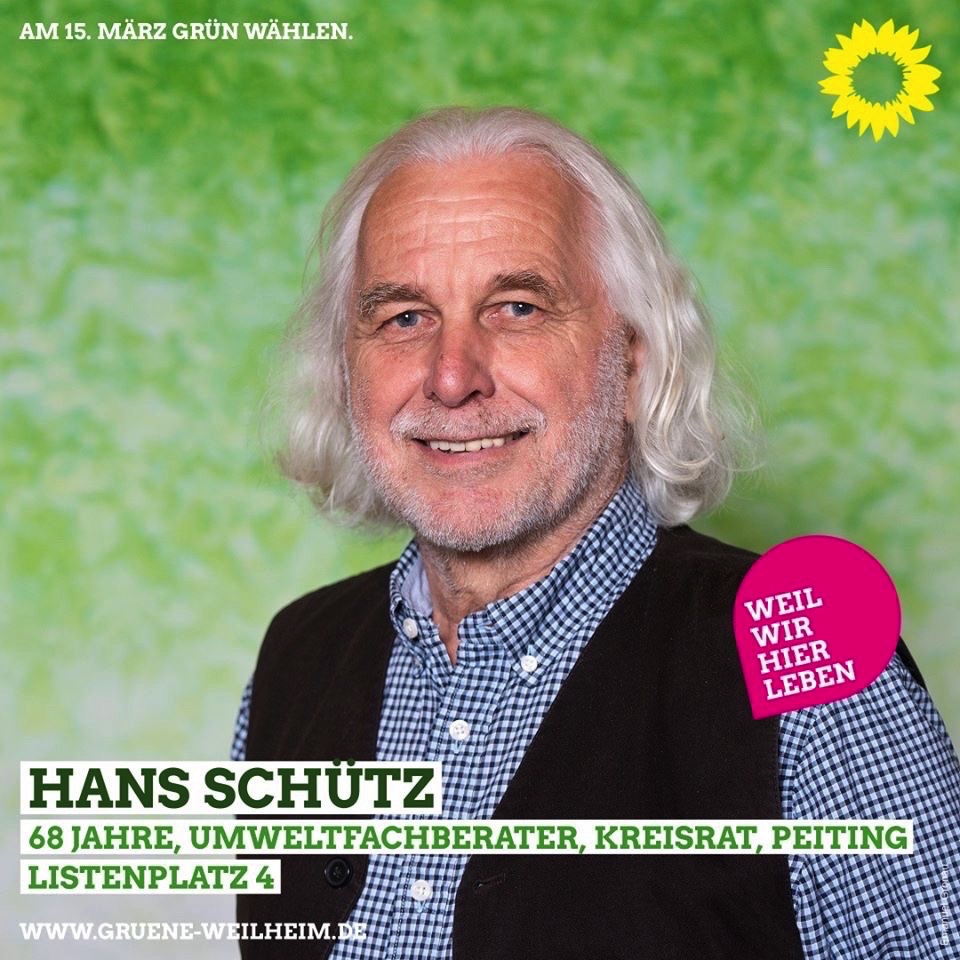 Schütz war und ist ein maßgeblicher Mann in der Grünen Kreistagsfraktion, so Grehl. Hans Schütz ist Mitbegründer und langjähriger Vorsitzender von "Das bessere Müllkonzept" und Mitherausgeber der OHA-Zeitung. Er ist Vorstandsbeirat vom Förderverein Nationalpark Ammergebirge und leitete viele Jahre die Umweltinitiative Pfaffenwinkel.