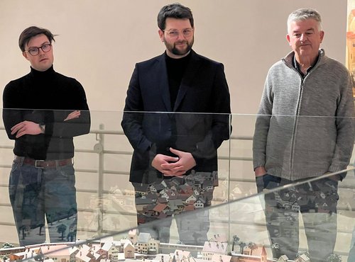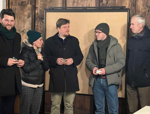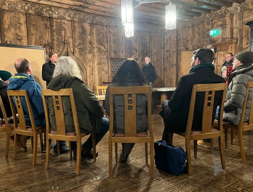 Beginnend im Schongauer Stadtmuseum spannte der Kreisheimatpfleger Dr. Jürgen Erhard, der den Abend als Stadtführer gestaltete, den Bogen von der frühen Geschichte Schongaus bis hin zum heutigen Tag. Politische Veränderungen prägten stets die Stadt und ihre Bürger und so erlebte Schongau zwar so manch schwere Zeit, thront aber bis in die Gegenwart so pittoresk auf dem dem Stadtberg, dass es viele Besucher in seinen Bann zieht. Nachhaltigkeit und Werhaftigkeit, zwei Begrifflichkeiten, die auch jetzt in anderen Zusammenhängen weltweit wieder bedeutend sind, waren stets lokal prägend. Im Serenadenhof, musste allerdings auch an die Ermordung unschuldiger Frauen in den Schongauer Hexenprozessen und an die Verbrechen der Nationalsozialisten erinnert werden. Die barocke Hl.Geist-Spitalkirche, St.Anna dagegen, ist für die Schongauer*innen in den letzten Jahren ein beliebter Ort für Konzerte geworden, dieses Jahr sogar im Rahmen des bayernweiten "out of the box Festivals". Ihren Abschluss fand die eisige Tour in der vertäfelten Ratsstube des Ballenhauses. Der Saal, der wie der Name schon sagt, den Räten als Tagungsort diente, zeigt noch die orginal Holzverkleidung in seinem Inneren. Die Ornamentik erzählt die reiche Geschichte der Stadt Schongau als bedeutender Punkt auf der Handelsroute zwischen Augsburg und Norditalien.