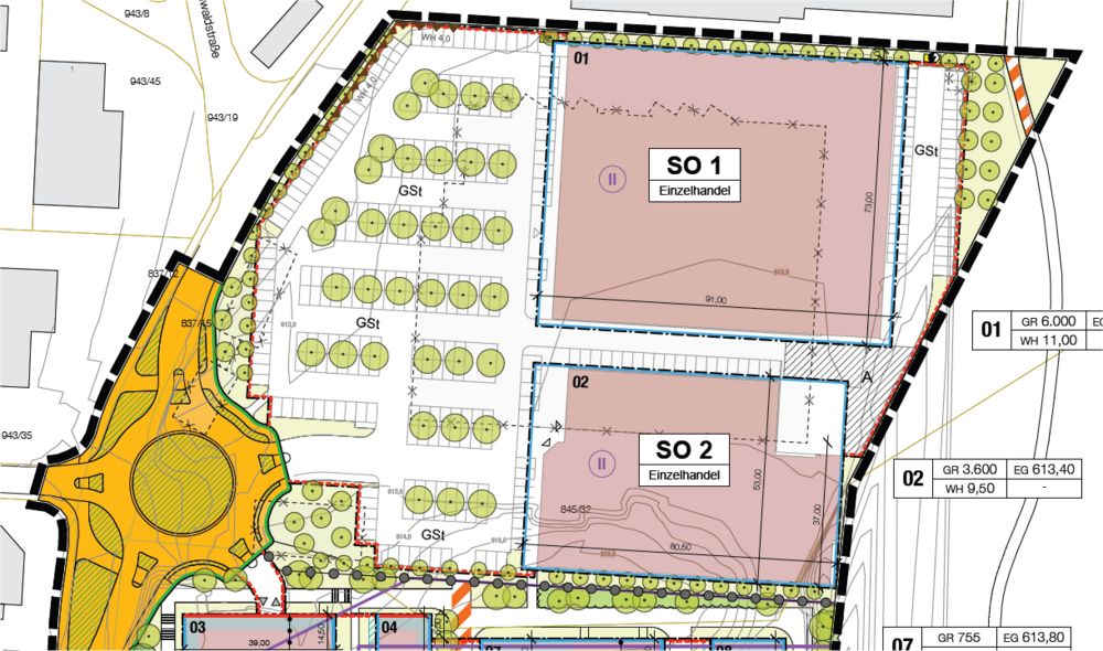 Die Verlagerung der Märkte sehen wir grundsätzlich positiv. Die antiquierten Freiflächenparkplätze waren eine Bedingung von EDEKA für einen Umzug und den Verkauf ihres Grundstückes im Süden, und konnten deshalb nicht verhindert werden. Das Festhalten am alten Standard führt außerdem zu eingeschossigen Bauten. Moderne Konzepte mit dem Ziel die Flächeneffizienz zu erhöhen und den Bodenverbrauch zu senken sucht man vergebens. Auch eine aufgeständerte Bauweise mit mehr grünem Aufenthaltsraum und damit weniger Versiegelung oder etwa eine Tiefgarage konnte sich nicht durchsetzen. Ebenso fehlt eine Festsetzung zur PV-Nutzung des Daches. Eine Nutzung mit PV-Modulen ist nicht ausgeschlossen und zumindest auf dem Dach von LIDL wird dies vermutlich umgesetzt. Lediglich eine etwas bessere Parkraumgestaltung ist zu verzeichnen. Diese Planung steht im krassen Gegensatz zu den Werbespots im Internet und Fernsehen, die ein modernes umweltbewusstes Bild von EDEKA zeichnen.