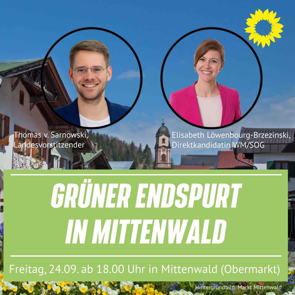 Daher freuen wir uns, dass wir unseren Landesvorsitzenden Thomas von Sarnowski für eine Abschlusskundgebung in Mittenwald gewinnen konnten, wo er zusammen mit unserer Direktkandidatin Elisabeth Löwenbourg-Brzezinski sprechen wird.