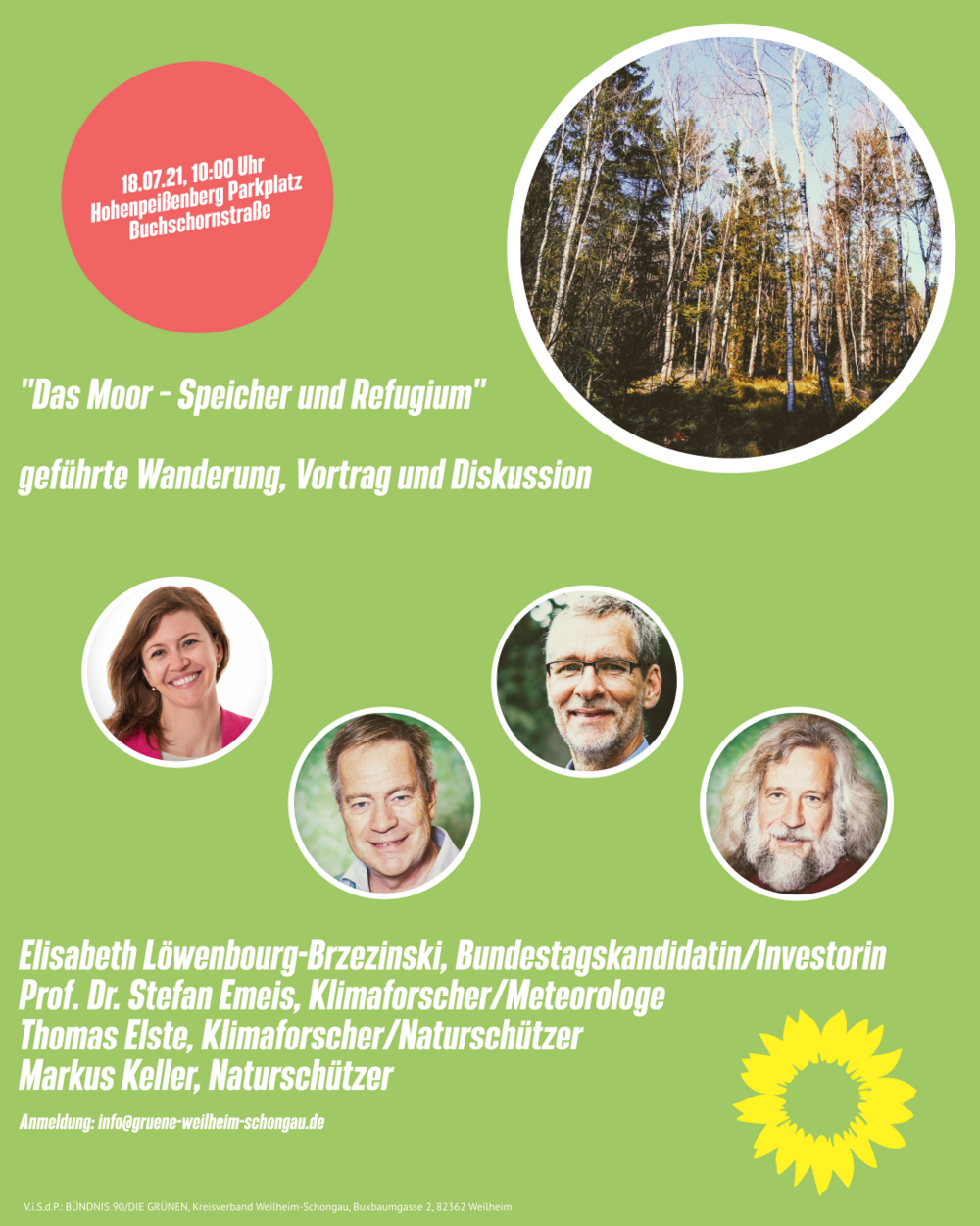 Elisabeth Löwenbourg-Brzezinski, Bundestagskandidatin für BÜNDNIS 90/DIE GRÜNEN im Wahlkreis 226, Weilheimerin und erklärte Naturliebhaberin, wird uns begleiten. Als Expertin für Grüne Finanzen und Wirtschaft, setzt sie sich für Grüne Zukunftsthemen ein, zu allererst im Kampf gegen den Klimawandel. Ihre Motivation seit jeher die Liebe zu Natur und Umwelt, in deren Erhalt wir investieren müssen.