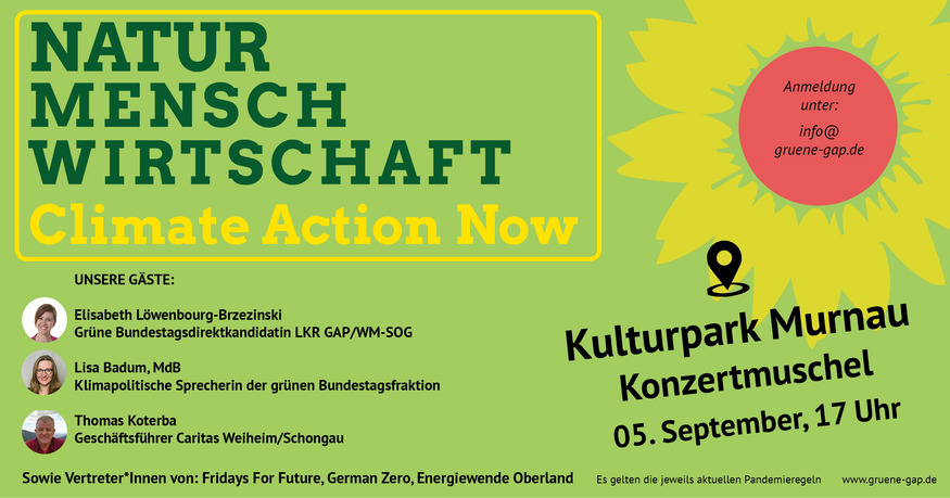 Darüber diskutiert Elisabeth Löwenbourg-Brzezinski, Wirtschafts- und Finanzexpertin und unsere Grüne Direktkandidatin für unseren Wahlkreis Garmisch-Partenkirchen/Weilheim-Schongau und mit Lisa Badum, klimapolitische Sprecherin der Bundestagsfraktion und Direktkandidatin für den Wahlkreis Bamberg/Forchheim mit einem lokalen Fridays for Future Aktivisten, Thomas Koterba, dem Geschäftsführer des Caritas Kreisverbandes Weilheim-Schongau und Mitverfasser des Positionspapier “Klimaschutz - ambitioniert und sozial gerecht gestalten” des Deutschen Caritasverbandes, Konrad Lang, Aktivist der Klimaschutzorganisation GermanZeround Andreas Scharli, Energiemanager bei der Energiewende Oberland.