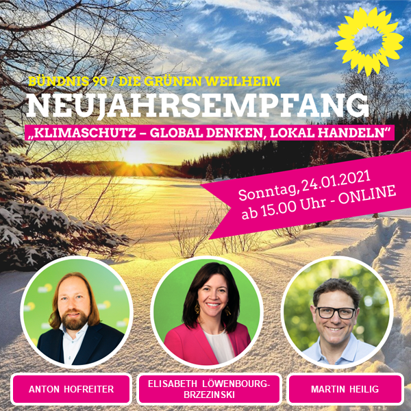Der globale Klimawandel ist eine gesamtgesellschaftliche Herausforderung, die neben Staaten auch die Kommunen und Unternehmen der Marktwirtschaft sowie jede/n Einzelne/n von uns in die Pflicht nimmt. Klimaschutz ist eines der wesentlichen Ziele Grüner Politik, den wir insbesondere mit dem vollständigen Kohleausstieg, der Verpflichtung zum Pariser Klimaabkommen im Völkerrecht, und einer ökologisch modernisierten, digitalen und leistungsfähigen Wirtschaft vorantreiben wollen. Interessierte die teilnehmen möchten können sich bis zum 23.01.2021, 17.00 Uhr per E-Mail unter: franziska.perl@gruene-weilheim.de anmelden. Sie schickt den Zugangslink zu.