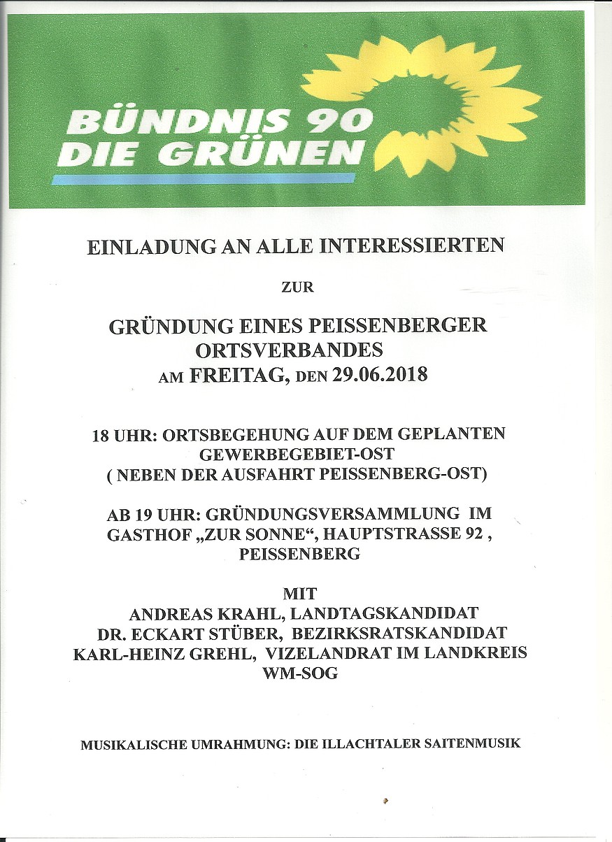 Davor, um 18.00 Uhr, laden die Peißenberger Grünen alle interessierten Bürger zu einer Begehung des schon vom Gemeinderat Peißenberg bewilligten Gewerbegebiets Ost auf der grünen Wiese an der B472 neben der Ausfahrt „Peißenberg Ost“ ein. Ab 19.00 Uhr wird die Wahl des Vorstands des neuen Ortsverbands Peißenberg in der „Sonne“ durchgeführt. Anschließend sprechen Andreas Krahl, Grüner Landtagskandidat für den Stimmkreis Weilheim-Schongau, Dr. Eckart Stüber, Bezirkstagskandidat sowie der Grüne Vizelandrat Karl-Heinz Grehl zu Themen aus der Region. Die Illachtaler Saitenmusik wird für gemütliche Stimmung sorgen.