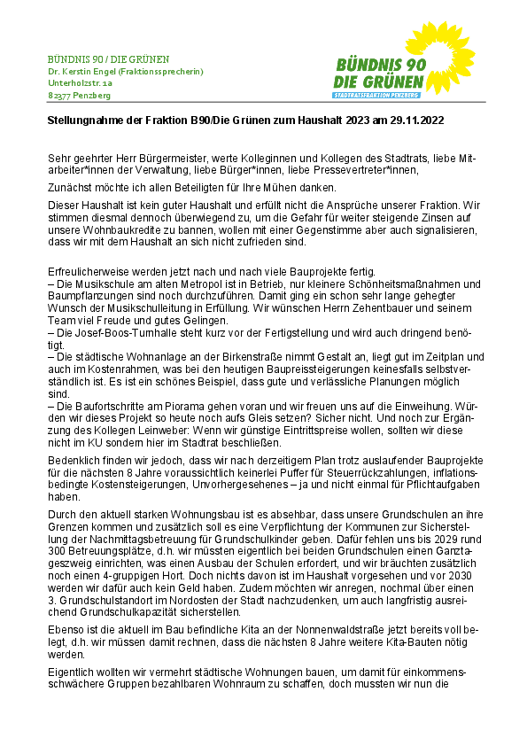 Stellungnahme und Begründung der nicht einstimmigen Zustimmung unserer Fraktion zum Haushalt 2023